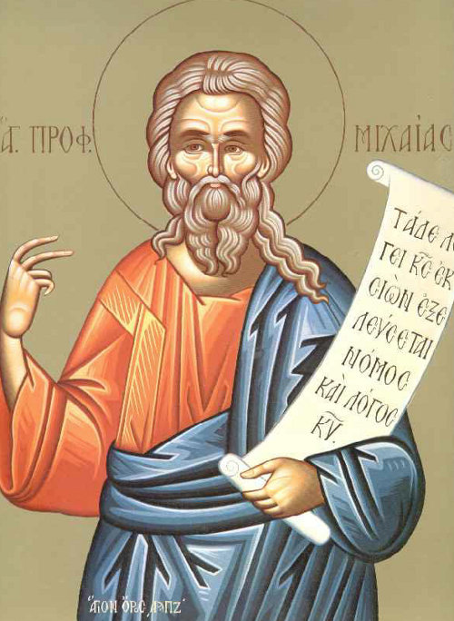 Ὡς ὀρὸς περίοπτον, καὶ ἐμφανὲς ἀληθῶς, προεῖδες ἐν Πνεύματι, τὴν Ἐκκλησίαν Χριστοῦ, Μιχαία θεόπνευστε, ὅθεν οἱ εὐρηκότες, ἐν αὕτῃ σωτηρίαν, βαίνουσιν ὡς προέφης, ἐν ταὶς τρίβοις Κυρίου, γεραίροντες προφῆτα, τὴν πάνσεπτον μνήμην σου.