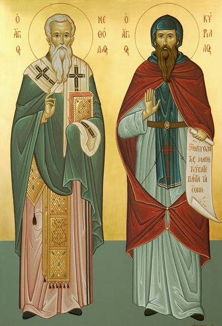 Τῶν Ἀποστόλων εἰσδεξάμενοι τὴν ἔλλαμψιν, τῶν Σλάβων ὤφθητε φωστῆρες καὶ διδάσκαλοι, τὸν τῆς χάριτος κηρύξαντες πάσι λόγον. Ἀλλὰ ὢ Κύριλλε παμμάκαρ καὶ Μεθόδιε πάσης βλάβης ἐκλυτρώσασθε καὶ θλίψεως τοὺς κραυγάζοντας, χαίροις ζεῦγος μακάριον.