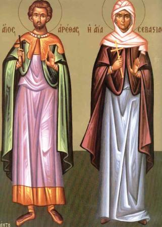 Εὐσεβείᾳ ἐμπρέπων τῇ ἀθλήσει δεδόξασαι, τὴν τῶν Χριστοκτόνων κακίαν καθελὼν τῇ ἐνστάσει σου· διὸ καὶ προσενήνοχας Χριστῷ, Μαρτύρων ἀρραγῆ συνασπισμόν, ὥσπερ θεῖος παιδοτρίβης καὶ ὁδηγός, Ἀρέθα παμμακάριστε. Δόξα τῷ δεδωκότι σοι ἰσχύν, δόξα τῷ σὲ στεφανώσαντι, δόξα τῷ ἐνεργοῦντι διὰ σοῦ, πᾶσιν ἰάματα.