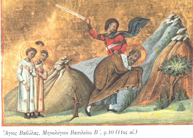 Στο τέλος αποκεφάλισαν και τα τρία διά ξίφους. Αλυσοδέσμιος παρίστατο ο Βαβύλας και τα εμψύχωνε στη διάρκεια του μαρτυρίου τους. Ύστερα έκλινε και ο ίδιος το κεφάλι του κάτω από το ξίφος του δημίου.