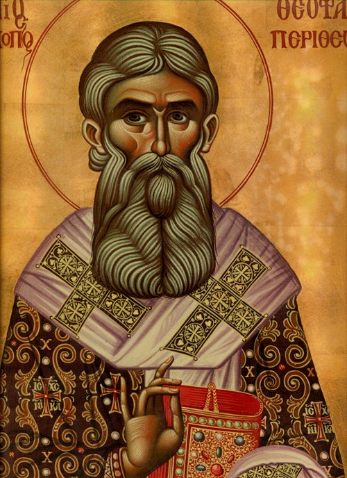 «Η επιμελημένη αποφυγή του Αγίου Θεοφάνους να μη μας αφήσει ίχνη και στοιχεία διά την αγιοπροσδιόριστη βιοτή του, δεν μας επιτρέπει να γνωρίζουμε πολλά για την ζωή, τη δράση και το έργο του. Έζησε τον 14ο αιώνα στα Καυσοκαλύβια του Αγίου Όρους. Μαθητής του Αγίου Μαξίμου του Καυσοκαλυβίτου, διετέλεσε ηγούμενος της Ιεράς Μονής Βατοπαιδίου και στην συνέχεια επίσκοπος Περιθεωρίου… Η παρουσία του ως Ποιμενάρχου στην τοπική μας Εκκλησία κατά τον 14ο αιώνα είναι βέβαιη. Εκείνο που έχει αξία για όλους μας είναι οι θερμές του πρεσβείες για το “ιερό κατάλοιπο” του ποιμνίου του στις χαλεπές ημέρες μας».