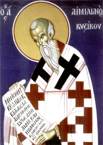 Ἐν Κυζίκῳ Ἅγιε, ἱερουργὸς ἀνεδείχθης, τοῦ Χριστοῦ τὸ ποίμνιον, ἐν εὐσεβείᾳ ἐκθρέψας· τοῦτο γοῦν διαφυλάττων ἐκ τῶν κινδύνων, φρούρει τε καὶ σκέπε πάντας τοὺς ἀνυμνοῦντας, εὐσεβῶς καὶ Ὀρθοδόξως, Τριάδα μίαν, δημιουργὸν τοῦ παντός.