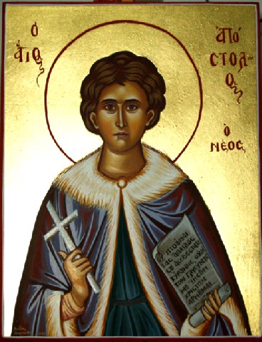 Ἀνδρικῷ φρονήματι, ἐν νεαρᾷ ἡλικίᾳ, διαπρέπον ἔνδοξε, ὡς στρατιώτης τοῦ Λόγου, ᾔσχυνας, τῶν ἐναντίων τὰς ἐπινοίας, ἤθλησας, μέχρι θανάτου γενναιοφρόνως· διὰ τοῦτό σε τιμῶμεν, Μεγαλομάρτυς Χριστοῦ Ἀπόστολε.
