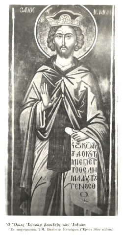 Θείας πίστεως, τὴ εἰσηγήσει, φῶς προσέλαβες, θεογνωσίας, Ἰωάσαφ Ὁσίων ἀγλάισμα, τοῦ Βαρλαὰμ λαμπρυνθεῖς γὰρ τοὶς ρήμασι, πρὸς ἀρετῶν τὴν ἀκρώρειαν ἔφθασας. Μεθ’ οὐ πρέσβευε, Τριάδι τὴ πανοικτίρμονι, δωρήσασθαι ἠμὶν τὸ μέγα ἔλεος.