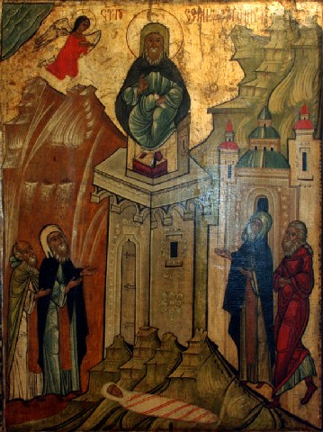 Τὰ ἄνω ζητῶν, τοῖς κάτω συναπτόμενος, καὶ ἅρμα πυρός, τὸν στύλον ἐργασάμενος, δι᾽ αὐτοῦ συνόμιλος, τῶν Ἀγγέλων γέγονας Ὅσιε, σὺν αὐτοῖς Χριστῷ τῷ Θεῷ, πρεσβεύων ἀπαύστως ὑπὲρ πάντων ἡμῶν.