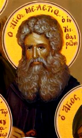 Δεῦτε νῦν τιμήσωμεν οἱ πιστοί, ἀσκητῶν τὸ κλέος, μοναζόντων τὴν καλλονήν, τὸν ὑπὲρ Κυρίου, θανόντα ἐν ἀσκήσει, συζῶντα δ’ ἐν Ἀγγέλοις, Χριστοῦ Μελέτιον.