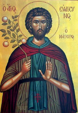 Εὐφροσύνης μέτοχος τῆς οὐρανίου, γεγονὼς Εὐφρόσυνε, τῇ ἰσαγγέλῳ σου ζωῇ, ὤφθης Ἀγγέλων ἰσότιμος, μεθ’ ὧν δυσώπει, ὑπὲρ τῶν τιμώντων σε.