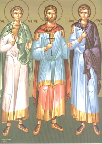 Βασάνων ἀνδρικῶς, ὑπομείναντες πόνους, τὴν ἄπονον ζωήν, ἐκομίσασθε ἅμα, Δορυμέδον καὶ Τρόφιμε, καὶ Σαββάτιε πάνσοφε· ὅθεν σήμερον, ἡ τοῦ Χριστοῦ Ἐκκλησία, ἑορτάζουσα, τὴν ἱερὰν ὑμῶν μνήμην, ἐνθέως ἀγάλλεται.