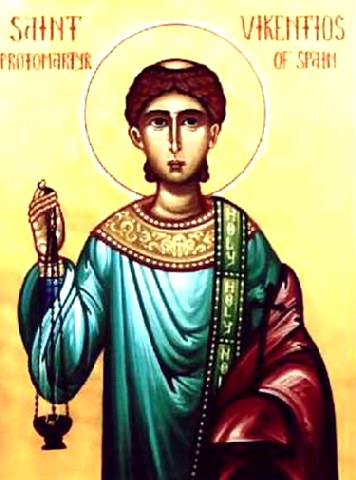 Ο Άγιος Βικέντιος γεννήθηκε στην Ουέσκα της Ισπανίας και από νεαρή ηλικία αφιερώθηκε στα γράμματα. Ψυχή φλεγόμενη από τη θεία φλόγα προσεκολλήθει, από τα εφηβικά του χρόνια, στον επίσκοπο της Σαραγόσης, Ουαλέριο.