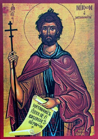 Τὴν Ἀγγελικὴν μιμούμενος πολιτείαν, κόσμου τὰ τερπνὰ ὡς σκύβαλα ἐλογίσω, μετανοίας τὴν τρίβον δεικνύων ἡμῖν, θεοφόρε Νίκων Ὅσιε· διὰ τοῦτό σε γεραίρομεν, ἐκτελοῦντες νῦν τὴν μνήμην σου· ὑπάρχεις γὰρ ἀληθῶς, ἰαμάτων πηγή.