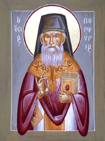 Πνευματέμφορος ὅλος καὶ ἀπαθέστατος, διακρίσεως φάρος φωτοειδέστατος, ἱερατεύων τῷ Χριστῷ, ὡς ἰσάγγελος ὤφθης. Προφήτης θαυμαστός, τὰ ἐγγὺς καὶ τὰ μακράν, προβλέπεις ὅσιε Πάτερ, Πορφύριε θεοφόρε, Ἁγίου Ὄρους τὸ ἀγαλλίαμα.