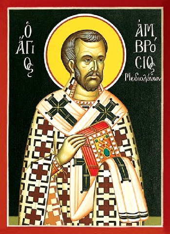 Τὸν τῆς ἀμβροσίας ἐπώνυμον, καὶ τῆς Ἰταλίας διδάσκαλον, τὸν προστάτην τῆς Χριστοῦ Ἐκκλησίας, καὶ Μεδιολάνων τὸν πρόεδρον, τὸν τοῦ ἐπάρχου υἱόν, καὶ τῶν πτωχῶν ἀντιλήπτορα μέγιστον, Ἀμβρόσιον τὸν ἔνδοξον Ἱεράρχην πάντες τιμήσωμεν, πρεσβεύει γὰρ Κυρίῳ ἐλεηθῆναι τὰς ψυχὰς ἡμῶν.