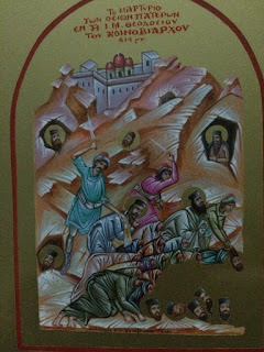 Όταν τα στίφη των απίστων επέδραμαν σαν λαίλαπα πυρός στο Μοναστηριακό συγκρότητα του Κοινοβιάρχου Οσίου άρχισαν ανελέητη σφαγή των Πατέρων που ήσυχα και αθόρυβα δοξολογούσαν το πάντιμο και μεγαλοπρεπές όνομα του Σωτήρος Χριστού. Κανείς δεν μπορούσε να αντισταθεί στη μανία τους.