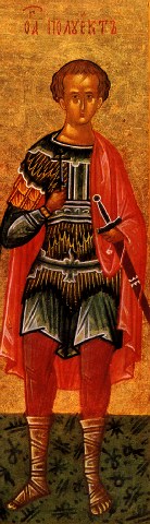 Μυηθεῖς οὐρανόθεν εὐσέβειας τὴν ἔλλαμψιν, ὤφθης στρατιώτης γενναῖος, τοῦ Σωτῆρος Πολύευκτε καὶ ξίφει ἐκτμηθεῖς τὴν κεφαλήν, Μαρτύρων ἠριθμήθης τοὶς χοροίς, μεθ’ ὧν πρέσβευε θεόφρον διὰ παντός, ὑπὲρ τῶν ἐκβοώντων σοῖ, δόξα τῷ δεδωκότι σοὶ ἰσχύν, δόξα τῷ σὲ στεφανώσαντι, δόξα τῷ δωρουμένῳ διά σοῦ, πάσι τὰ κρείττονα.