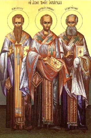 Τοὺς μεγάλους φωστῆρας τοὺς φεραυγεῖς, Ἐκκλησίας τοὺς πύργους τοὺς ἀρραγεῖς, συμφώνως αἰνέσωμεν, οἱ τῶν καλῶν ἀπολαύοντες, καὶ τῶν λόγων τούτων, ὁμοῦ καὶ τῆς χάριτος· τὸν σοφὸν Χρυσορρήμονα, καὶ τὸν μέγαν Βασίλειον, σὺν τῷ Γρηγορίῳ, τῷ λαμπρῷ θεολόγῳ· πρὸς οὓς καὶ βοήσωμεν, ἐκ καρδίας κραυγάζοντες· Ἱεράρχαι τρισμέγιστοι, πρεσβεύσατε Χριστῷ τῷ Θεῷ, τῶν πταισμάτων ἄφεσιν δωρήσασθαι, τοῖς ἑορτάζουσι πόθῳ, τὴν Ἁγίαν μνήμην ὑμῶν.