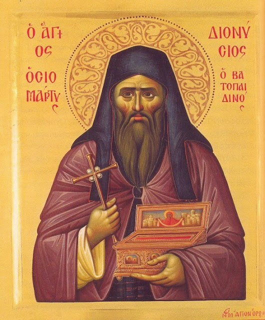 Ο Οσιομάρτυρας Διονύσιος, μοναχός της Μονής Βατοπαιδίου, απεστάλη το 1822 στην Κρήτη, ως συνοδός της Αγίας Ζώνης της Θεοτόκου εξαιτίας μιας επιδημίας που μάστιζε το νησί. Επειδή τότε εκδηλώθηκε και στην Κρήτη η επανάσταση, οι Τούρκοι τον συνέλαβαν ως όμηρο και τον πίεζαν να ασπαστεί τον Ισλαμισμό.