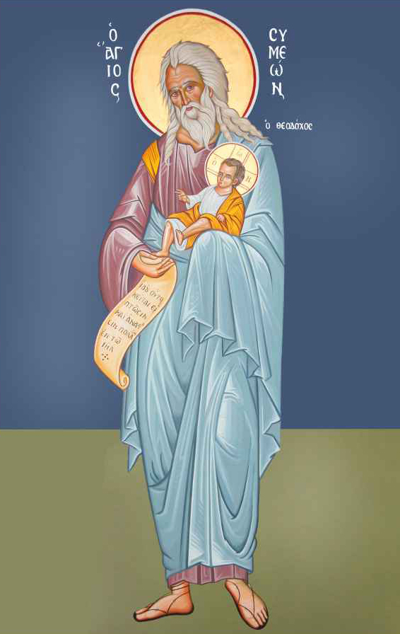 Τὸν Ὕπερθεον Λόγον σάρκα γενόμενον, ἐνηγκαλίσω ὡς βρέφος ἐν τῷ Ναῷ τοῦ Θεοῦ, Θεοδόχε Συμεὼν Πρεσβῦτα ἔνδοξε, ὅθεν καὶ Ἄννα ἡ σεπτή, ἀνθομολόγησιν αὐτῶ, προσήγαγεν ὠς Προφήτις, ὅθεν ὑμᾶς εὐφημοῦμεν, οἴα Χριστοῦ θείους θεράποντος.