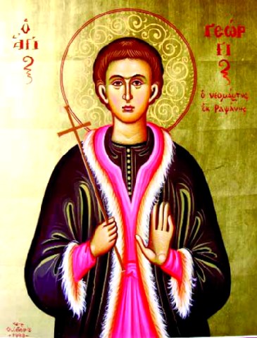 Της Ραψάνης τόν γόνον καί θερμόν αντιλήπτορα, και νεοφανή στρατιώτην, του των όλων δεσπόζοντος, Γεώργιον τον Νέον αθλητήν, τιμήσωμεν εν ύμνοις οι πιστοί· πάσαν χάριν γαρ παρέχει παρά Θεώ, τοις προς αυτόν κραυγάζουσι· δόξα τω δεδωκότι σοι ισχύν, δόξα τω σε στεφανώσαντι, δόξα τω ενεργούντι δια σου, πάσιν ιάματα.