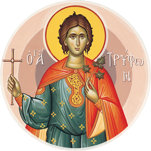 Ὁ Ἅγιος Τρύφων καταγόταν ἀπὸ τὴ Λάμψακο τῆς ἐπαρχίας Φρυγίας καὶ ἔζησε στὰ χρόνια τῶν αὐτοκρατόρων Γορδιανοῦ Γ’ (238 – 244 μ.Χ.), Φιλίππου (244 – 249 μ.Χ.) καὶ Δεκίου (249 – 251 μ.Χ.).