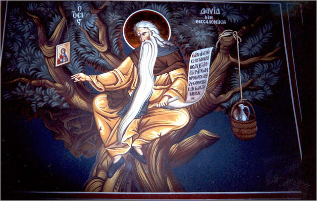 Τῇ ἀγάπῃ τοῦ Λόγου Πάτερ πτερούμενος, ἐπὶ τοῦ δένδρου διῆλθες ἀγγελικὴν βιοτήν, καὶ ἐξήνεγκας ἡμῖν καρποὺς τῆς χάριτος· ἐξ ὧν τρυφῶντες νοητῶς, ἐκβοῶμέν σοι πιστῶς, Δαβὶδ Ὁσίων ἀκρότης· μὴ διαλίπῃς πρεσβεύων, ἐλεηθῆναι τὰς ψηχὰς ἡμῶν.