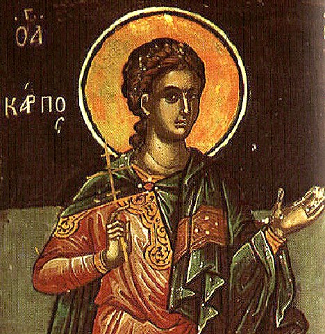 Θείας χάριτος, τῇ κοινωνίᾳ, ἐκοινώνησας, δεσμῶν τῷ Παύλῳ, θεομακάριστε Κάρπε Ἀπόστολε, καὶ κοινωνοὺς θείας δόξης ἀνέδειξας, τοὺς δεξαμένους τὸ φέγγος τῶν λόγων σου. Ὅθεν πρέσβευε, Χριστῷ τῷ Θεῷ πανεύφημε, δωρήσασθαι ἡμῖν τὸ μέγα ἔλεος.