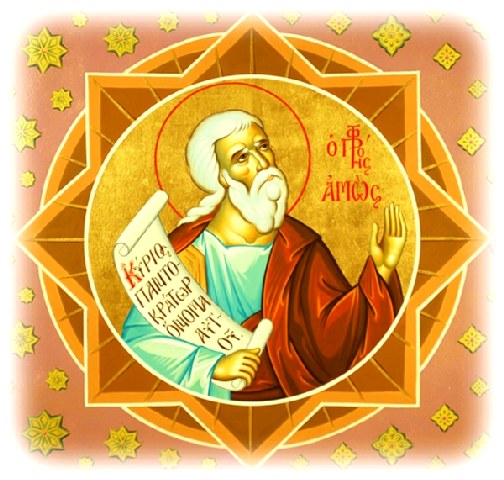 Χαίροις ὦ Προφῆτα Θεοῦ Ἀμώς· τὴν γὰρ πεπτωκυῖαν, ὡς προέφης σκηνὴν Δαβίδ, σαρκωθεὶς ὁ Λόγος, ἀνέστησεν ἐνδόξως, καὶ ταύτην θεουργήσας, Πατρὶ προσήγαγε.