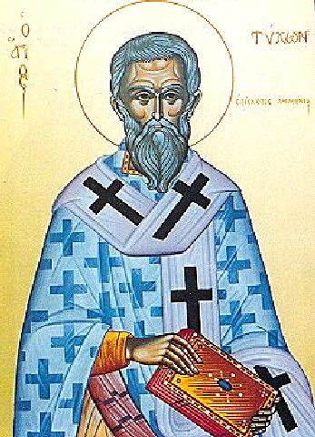 Ἐν ἀσκήσει Ἅγιε, θεοφιλεῖ διαπρέψας, Παρακλήτου δύναμιν, ἐξ ὕψους καθυπεδέξω, ξόανα, καθαιρεῖν πλάνης, λαοὺς δε σώζειν, δαίμονας, ἀποδιώκειν, νόσους ἰᾶσθαι· διὰ τοῦτο σε τιμῶμεν, ὡς Θεοῦ φίλον, Τύχων μακάριε.