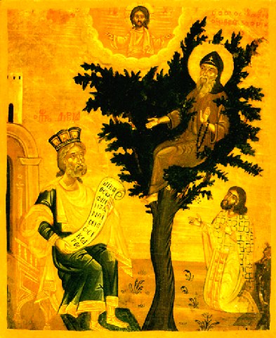 Ἐγκρατείᾳ τὰ πάθη τὰ τῆς σαρκός, τῇ ψυχῇ ὑποτάξας Πάτερ σοφέ, ὡράθης μακάριε, μετὰ σώματος Ἄγγελος, καλιὰν δὲ πήξας, ὡς ὄρνις εὐκέλαδος, ἐν φυτῷ εἰς ὕψος, τὸν νοῦν ἀνεπτέρωσας· ὅθεν τῶν θαυμάτων, ἐνεργείας πλουτήσας, μετῆλθες πρὸς Κύριον, ὃν ἐκ βρέφους ἐπόθησας· διὰ τοῦτο βοῶμέν σοι· Πρέσβευε Χριστῷ τῷ Θεῷ, τῶν πταισμάτων ἄφεσιν δωρήσασθαι, τοῖς ἑορτάζουσι πόθῳ τὴν ἁγίαν μνήμην σου.