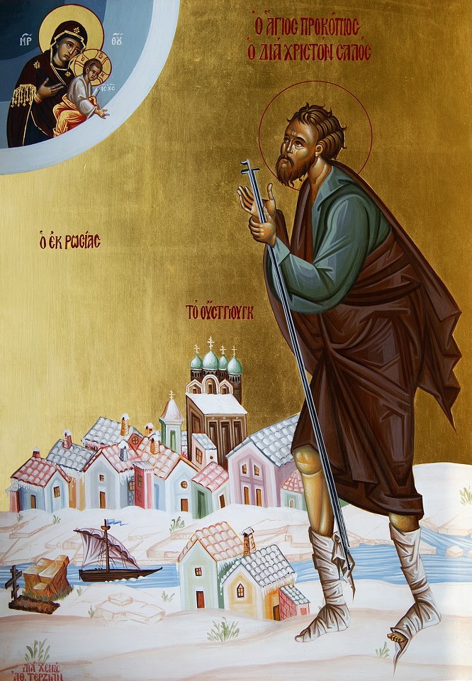 Ο Όσιος Προκόπιος ο δια Χριστόν σαλός ο εν Ουστούζη, ο θαυματουργός κοιμήθηκε το 1303 μ.Χ. και η Αγιοκατάταξη του από την Ρώσικη Εκκλησία έγινε το 1818 μ.Χ.