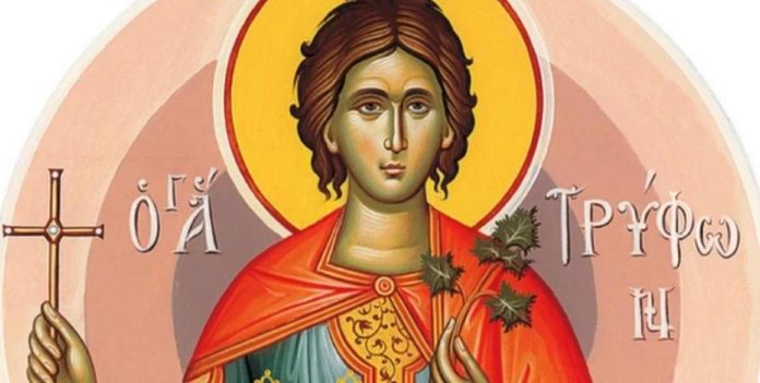 Ὁ Ἅγιος Τρύφων καταγόταν ἀπὸ τὴ Λάμψακο τῆς ἐπαρχίας Φρυγίας καὶ ἔζησε στὰ χρόνια τῶν αὐτοκρατόρων Γορδιανοῦ Γ’ (238 – 244 μ.Χ.), Φιλίππου (244 – 249 μ.Χ.) καὶ Δεκίου (249 – 251 μ.Χ.).