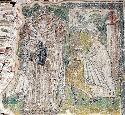 Στη βασιλική του Αγίου Δημητρίου, επάνω από το τοξωτό άνοιγμα που οδηγεί από το νότιο κλίτος στον νάρθηκα, εικονίζεται σε ψηφιδωτό ο άγιος Δημήτριος μπροστά από μαρμάρινο κιβώριο, προς τον οποίο κατευθύνονται αποδίδοντας ευχαριστία δύο παιδιά με τους ενήλικες συνοδούς τους.