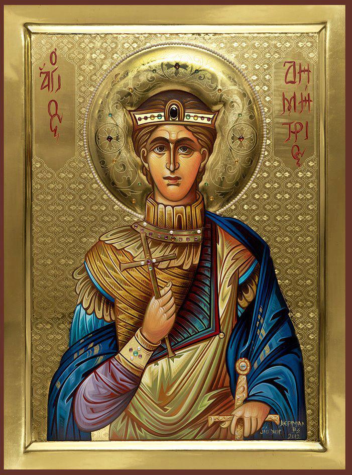Εὐσεβείας τοῖς τρόποις καταπλουτῶν, ἀσεβείας τὴν πλάνην καταβαλών, Μάρτυς κατεπάτησας, τῶν τυράννων τὰ θράση, καὶ τῷ θείῳ πόθῳ, τὸν νοῦν πυρπολούμενος, τῶν εἰδώλων τὴν πλάνην, εἰς χάος ἐβύθισας· ὅθεν ἐπαξίως, ἀμοιβὴν τῶν ἀγώνων, ἐδέξω τὰ θαύματα, καὶ πηγάζεις ἰάματα, Ἀθλοφόρε Δημήτριε, πρέσβευε Χριστῷ τῷ Θεῷ,