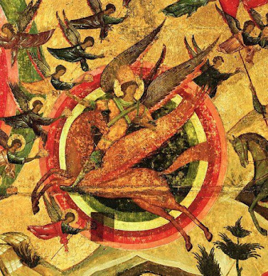 Μια εικόνα που συνηθίζεται περισσότερο στον ρωσικό κόσμο.Το ”στώμεν καλώς’ του Αρχαγγέλου Μιχαήλ τότε που υπό τον Εωσφόρο επαναστάτησαν και έπεσαν τόσοι άγγελοι κατά τον ουράνιο αυτό πόλεμο.