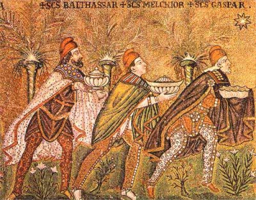 Αυτός πρόσφερε το λιβάνι ως δώρο στον Κύριο. Ο τρίτος ονομαζόταν Βαλτάσαρ· είχε μελαχρινή επιδερμίδα και δασύτριχη γενειάδα. Αυτός πρόσφερε ως δώρο στον Κύριο το μύρο. Αυτοί ήταν οι «μάγοι με τα δώρα».