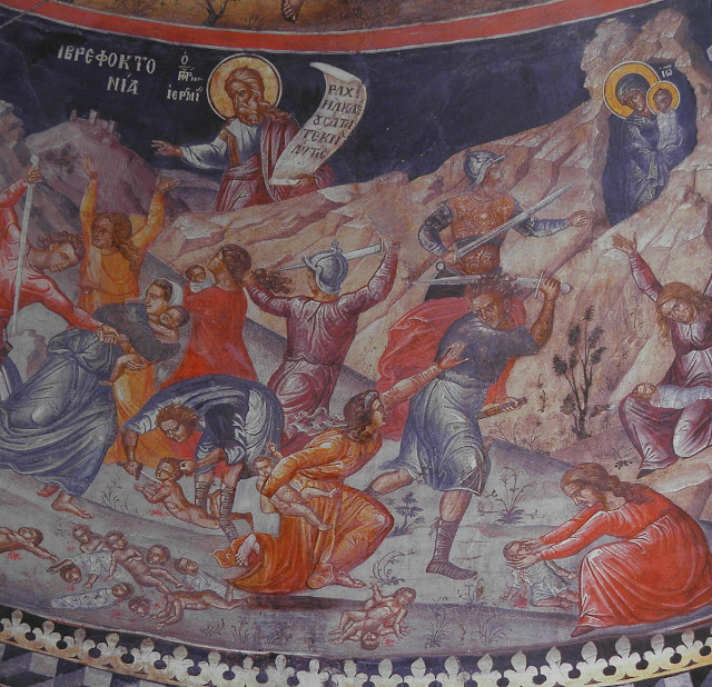 Σε αυτή τη γραμμή τής θεολογικής σημειολογίας, η σφαγή τών νηπίων φέρνει επίσης στο νου και την προφητεία τού Ιερεμία, ο οποίος επτά αιώνες πριν είχε προαναγγείλει προφητικά και περιγράψει ποιητικά την ακόλουθη αποκαλυπτική σκηνή: “Φωνή εν Ραμά ηκούσθη θρήνος και κλαυθμός και οδυρμός πολύς. Ραχήλ κλαίουσα τα τέκνα αυτής και ουκ ήθελε παρακληθήναι, ότι ουκ εισίν” (Ιερεμίας 31/λα΄ 15).