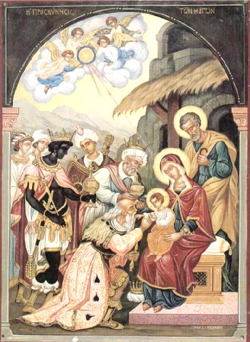 «Και ελθόντες εις τον οίκίαν είδον το παιδίον μετά Μαρίας της μητρός αυτού, και πεσόντες προσεκύνησαν αύτω και άνοίξαντες τους θησαυρούς αυτών προσήνεγκαν αύτω δώρα, χρυσόν και λίβανον και σμύρναν»