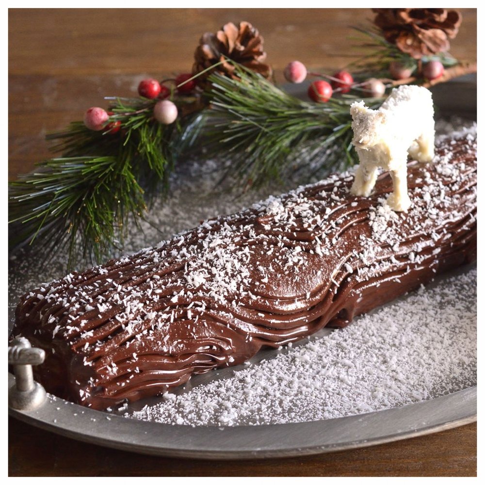 Στολίζουμε τον κορμό με τα μαρόν γλασέ, τα σμέουρα την τριμμένη σοκολάτα και κοσκινίζουμε στην επιφάνεια του λίγο κακάο.