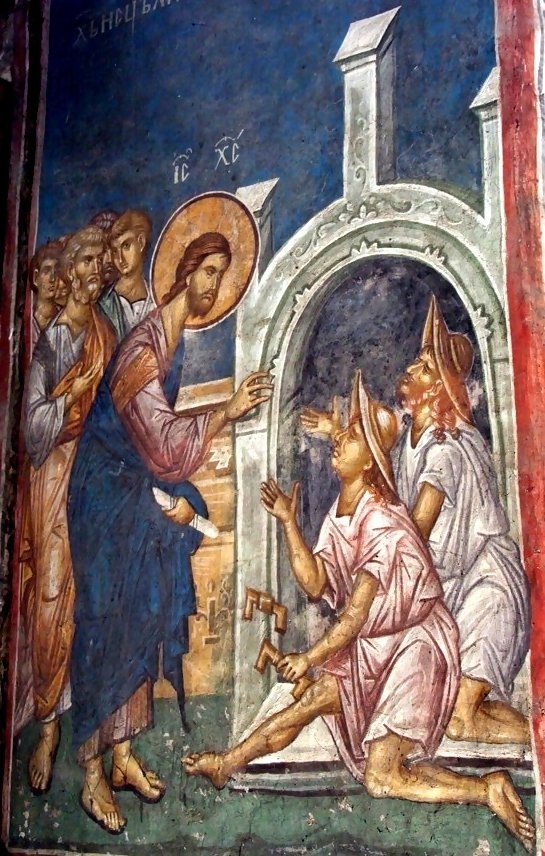 Εκεῖνο τὸν καιρό, καθὼς προχωροῦσε ᾿Ιησοῦς, τὸν ἀκολούθησαν δύο τυφλοί, ποὺ φώναζαν κι ἔλεγαν «Σπλαχνίσου μας, Υἱὲ τοῦ Δαβίδ!» Κι ὅταν ἔφτασε στὸ σπίτι, πῆγαν κοντά του οἱ τυφλοί, καὶ ὁ ᾿Ιησοῦς τοὺς λέει