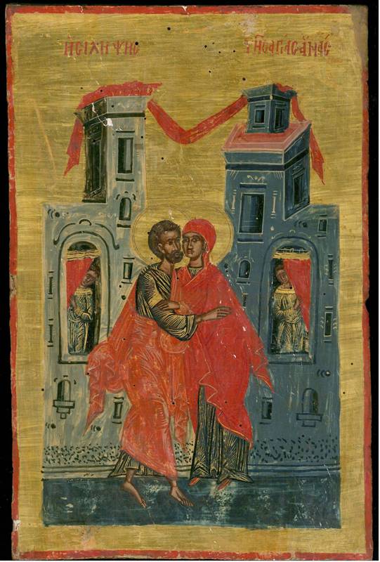 Σήμερον της ατεκνίας δεσμά διαλύονται του Ιωακείμ γαρ και της Άννας, εισακούων Θεός, παρ’ ελπίδα τεκείν αυτούς, σαφώς υπισχνείται Θεόπαιδα, εξ ης αυτός ετέχθη ο απερίγραπτος, βροτός γεγονώς, δι’ Αγγέλου κελεύσας βοήσαι αυτή, χαίρε Κεχαριτωμένη ο Κύριος μετά σου.
