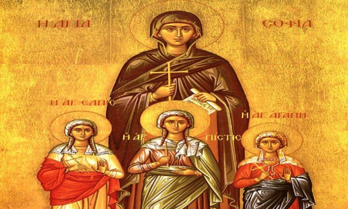 Η Αγία Σοφία και οι κόρες της Πίστη, Ελπίς, Αγάπη, καταγόταν από μια μεγάλη πόλη της Ιταλίας και έζησαν επί Αυτοκράτορος Αδριανού (117 – 138 μ.Χ.), πήραν δε τα ονόματα τους από το χωρίο της Καινής Διαθήκης στον «ύμνο της αγάπης»: «νυνί δε μένει πίστις, ελπίς, αγάπη, τα τρία ταύτα• μείζων δε τούτων η αγάπη» ( Α’ Κορ. 13:13).