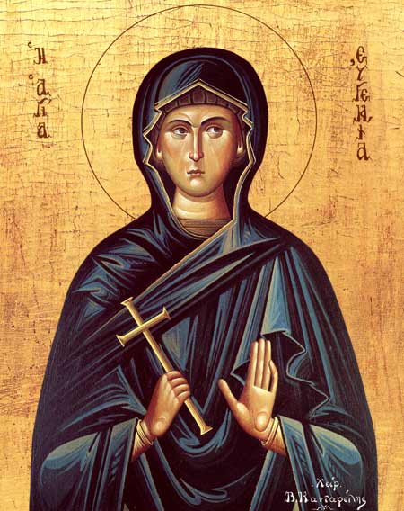 Θείου πνεύματος, τῇ ὑμνωδίᾳ, φῶς προσέλαβες θεογνωσίας, Εὐγενία Χριστοῦ καλλιπάρθενε· καὶ ἐν Ὁσίων χορείᾳ ἐκλάμψασα, ἀθλητικῶς τὸν ἐχθρὸν ἐθριάμβευσας. Μάρτυς ἔνδοξε, Χριστὸν τὸν Θεὸν ἱκέτευε, δωρήσασθαι ἡμῖν τὸ μέγα ἔλεος.