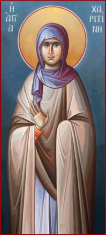 Θεία χάριτι, κραταιωθεῖσα, κράτος ἤσχυνας, τῆς δυσσεβείας, Χαριτίνη ὑπὲρ φύσιν ἀθλήσασα ὅθεν χαρίτων πηγὴν ἀδαπάνητον, ὡς γλυκασμὸν ἀναβλύζεις τοὶς κράζουσι. Μάρτυς ἔνδοξε, Χριστὸν τὸν θεὸν ἱκέτευε, δωρήσασθαι ἠμὶν τὸ μέγα ἔλεος.