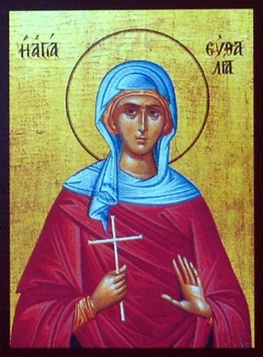 Η Αγία Εύθαλία ζούσε στη Σικελία και είχε μητέρα αιμορροούσα, που ονομαζόταν και αυτή Ευθαλία. Κάποτε λοιπόν η μητέρα της, είδε στο όνειρο της τους Άγιους Μάρτυρες Αλφειό, Φιλάδελφο και Κυπρίνο, που τη μνήμη τους γιορτάζουμε στις 10 Μαΐου, οι όποιοι της είπαν ότι αν πιστέψει στον Χριστό και βαπτισθεί, θα γιατρευτεί και θα σωθεί.