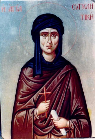 Ἀρετῶν ἐκλάμψασα, ταῖς οὐρανίαις ἀκτῖσιν, ὡς λαμπὰς ἀείφωτος, Συγκλιτικὴ θεοφόρε, ἤμβλυνας, τοῦ παλαμναίου ἐχθροῦ τὰ κέντρα, ἴθυνας πρὸς τὸν νυμφῶνα τῆς ἄνω δόξης, δῆμον ἅγιον παρθένων, μεθ’ ὧν δυσώπει, ἐλεηθῆναι ἡμᾶς.