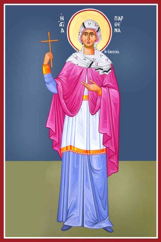 Ἑορτάζει σήμερον, τῶν Ἐδεσσαίων ἡ πόλις, τὴν ἁγίαν μνήμην σου, Παρθενομάρτυς Παρθένα· χαίρει γάρ, πιστῶς σε θρέψασα ἐν Κυρίῳ, μέλπουσα, τοῦ μαρτυρίου σου τοὺς ἀγῶνας, οὓς διήνυσας ἀνδρείως, ὑπὲρ τῆς δόξης Χριστοῦ πανεύφημε.