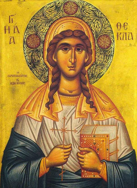 Τοῦ Παύλου συνέκδημος, ὡς καθαρὰ τὴν ψυχήν, καὶ πρώταθλος πέφηνας, ἐν γυναιξὶν εὐκλεῶς, Χριστὸν ἀγαπήσασα· σὺ γὰρ τῆς εὐσεβείας, πτερωθεῖσα τῷ πόθῳ, ἤθλησας ὑπὲρ φύσιν, Ἰσαπόστελε Θέκλα· διὸ σὲ ὁ Πανοικτίρμων νύμφην ἠγάγετο.