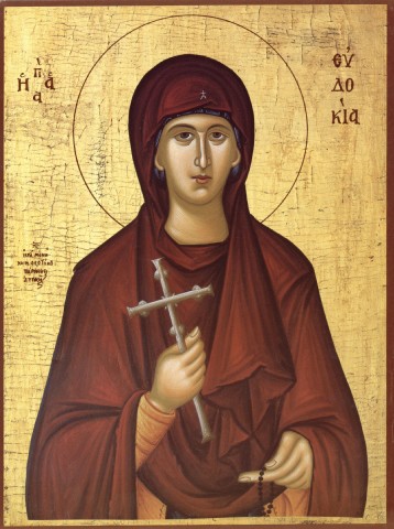 Φόβον ἔνθεον, ἀναλαβοῦσα, κόσμου ἔλιπες, τὴν εὐδοξίαν, καὶ τῷ Λόγῳ Εὐδοκία προαέδραμες, οὐ τὸν ζυγὸν τὴ σαρκί σου βαστάσασα, ὑπερφυῶς ἠγωνίσω δι’ αἵματος. Μάρτυς ἔνδοξε, Χριστὸν τὸν Θεὸν ἱκέτευε, δωρήσασθαι ἠμὶν τὸ μέγα ἔλεος.