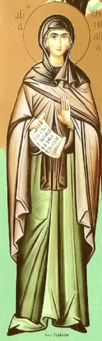 Σωφρόνως τὸν βίον σου κατ’ ἐναντίον Θεοῦ, ἐτέλεσας πρότερον σὺν Βασιλείω σεμνῶ, Ἐμμέλεια πάνσεμνε, εἴτα δὲ ἐν ἐρήμῳ, ἀναβάσεις διέθου ἅμα τοὶς σοὶς ἐκγόνοις, ὡς τὰ ἄνω ποθοῦσα, διὸ σὲ ὁ Χριστὸς πανοικοί, ὑπερεδόξασε.
