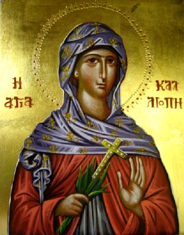 Του Σωτήρος το κάλλος εκ ψυχής αγαπήσασα, καλλιπάρθενε κόρη, Καλλιόπη πανεύφημε, ηγώνισαι στερρώς υπέρ αυτού, και δόξης ηξιώθης θεϊκής, δια τούτο σου την μνήμην την ιεράν, τιμώμεν εκβοώντές σοι, δόξα τω δεδωκότι σοι ισχύν, δόξα τω σε στεφανώσαντι, δόξα τω χορηγούντι δια σού, ημίν πταισμάτων άφεσιν.