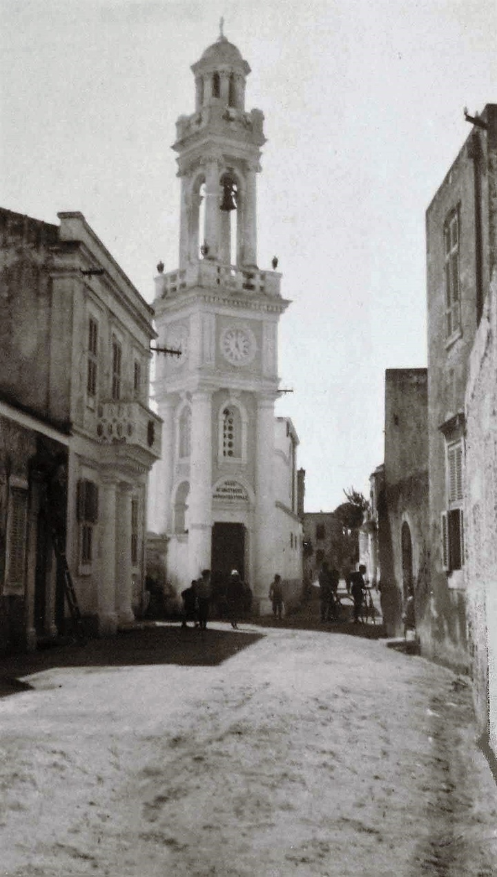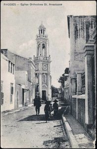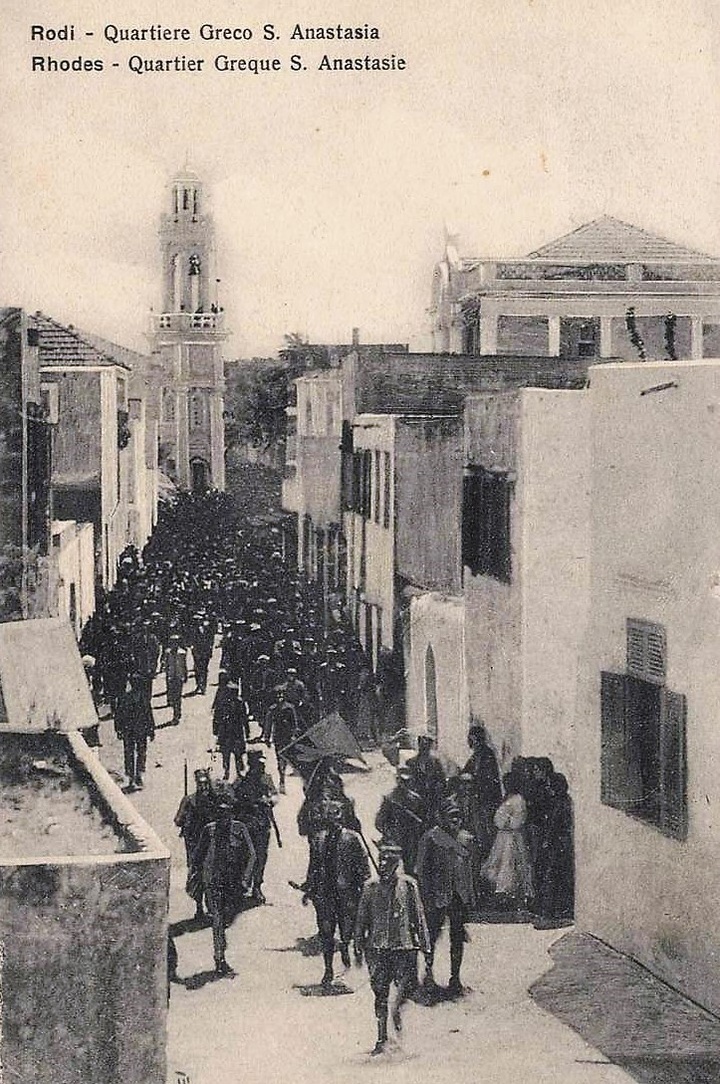 Η Αγία Αναστασία του 1900. Από την οδό αυτή πέρασαν οι ιταλικές δυνάμεις, το Μάιο 1912, και κατέλαβαν την πόλη της Ρόδου. Στο βάθος δεν διακρίνεται το κλασικό σπίτι του Αθανασίου Καζούλλη-άρχισε να ανεγείρεται στα τέλη της δεκαετίας του 1910 με αρχές του 1920.